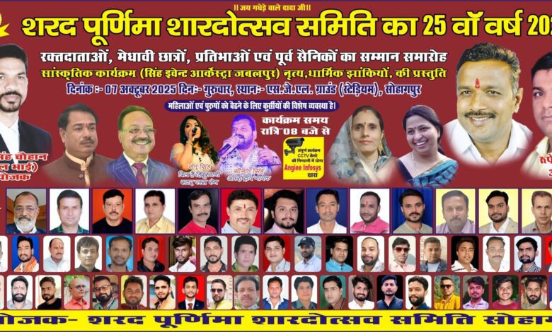 सोहागपुर नगर में प्रतिवर्ष शरद पूर्णिमा पर शरद उत्सव समिति सम्मान समारोह का आयोजन करती है जिसमें मेधावी छात्र-छात्राएं, पूर्व एवं वर्तमान सैनिक, रक्तदाता, शिक्षकों सहित प्रशासनिक अधिकारी कर्मचारियों के सम्मान के साथ ही सांस्कृतिक आयोजन आर्केस्ट्रा होता है इस वर्ष 7 अक्टूबर दिन मंगलवार रात्रि 8:00 बजे से एस जे एल स्टेडियम ग्राउंड में आयोजन हो रहा है शरदोउत्सव समिति के 25 में वर्ष का आयोजन सिल्वर जुबली सम्मान समारोह के साथ धूमधाम से मनाया जाएगा इस वर्ष जबलपुर की सिंह इवेंट अपने डांस ग्रुप के साथ शानदार प्रस्तुति के लिए आ रहे हैं जिसमें सारेगामा फिल्म एवं अंतरराष्ट्रीय गायक आएंगे कार्यक्रम में मुख्य अतिथि ग्रुप में क्षेत्र के विधायक ठाकुर विजयपाल सिंह, सविता दीवान शर्मा पूर्व विधायक,नगर परिषद अध्यक्ष लता यशवंत पटेल, हरगोविंद पुरबिया हरगोविंद मध्य प्रदेशकांग्रेस कमेटी पूर्व महामंत्री, जे पी मेहरा मेहरा समाज के प्रदेश अध्यक्ष रहेंगे इसके साथ ही नगर के अन्य गणमान्य नागरिक भी मंच की शोभा बढ़ाएंगे समिति के द्वारा बड़े स्तर पर सिल्वर जुबली आयोजन की तैयारी कर रही है समिति के अध्यक्ष रूपेश मेहरा ने बताया कि इस वर्ष आम नागरिकों के लिए स्टेडियम में बैठने की व्यवस्था की जा रही है साथ ही नगर के आमंत्रित महिला पुरुष एवं गणमान्य नागरिक सहित सभी श्रोताओं के लिए कुर्सियों की उत्तम व्यवस्था अलग-अलग रखी गई है भव्य आतिशबाजी की व्यवस्था भी की जा रही है कार्यक्रम के आगे पवन सिंह चौहान ने बताया कि आर्केस्ट्रा में धार्मिक झांकियां ग्रुप डांस के साथ ही सोलो डांस की प्रस्तुति भी होगी समिति पिछले 24 वर्षों से नगर का प्रतिष्ठित सम्मान समारोह का आयोजन करते आ रही है उनके सम्मान में प्रति वर्ष सांस्कृतिक आयोजन किया जाता है समिति द्वारा आमंत्रित अतिथियों के लिए फ्री पास की व्यवस्था की है जिससे आमंत्रित लोगों को बैठने की उत्तम व्यवस्था मिल सके शरद पूर्णिमा पर आयोजित होने वाले इस आयोजन को लेकर लोगों में बड़ा उत्साह रहता है और कार्यक्रम देखने के लिए लोग इंतजार करते हैं