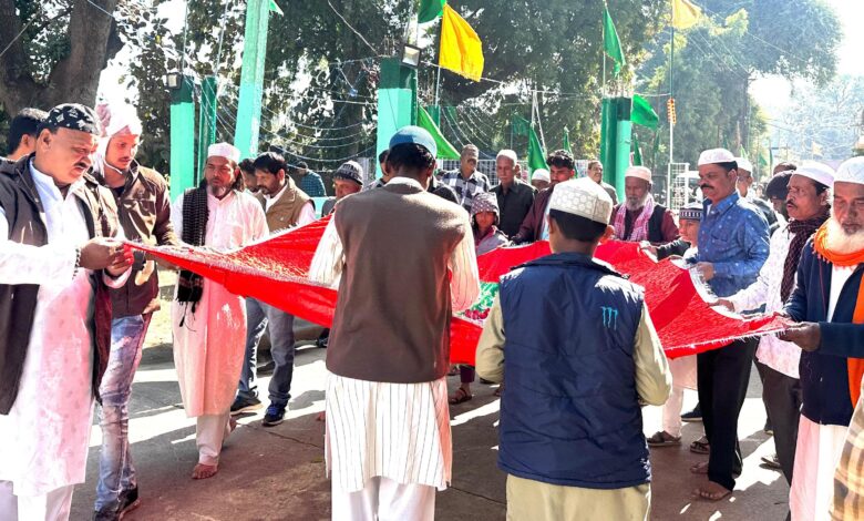 नगर के मुस्लिम समुदाय ने ख़्वाजा पीर पलाश परिसर पर चादर चढ़ाकर अमन चैन कायम रखने की दुआ की
