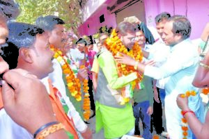 कांग्रेस प्रत्याशी गिरीश शर्मा का लोग फूल बरसाकर कर रहे है स्वागत